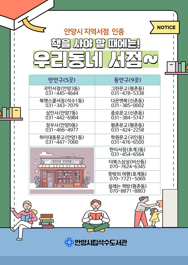 해당 사업은 안양시11개 시립도서관이 관내 지역서점을 통해 도서를 구입하는 방식으로 추진되며, 2025년도 도서 구입예산 10억 5000만원이 지역서점 지원에 투입된다.