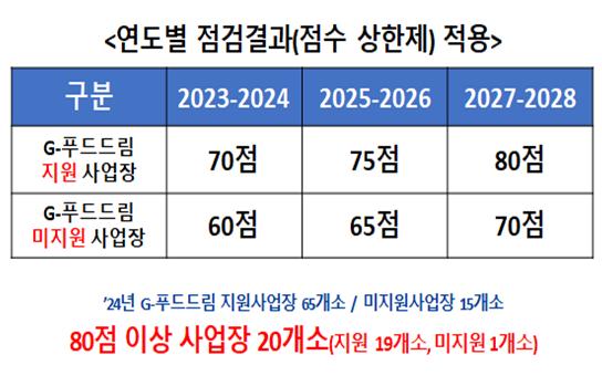 예를 들어, 작년까지 상한선이 70점이었으나 올해는 75점으로, 2027년에는 80점이 된다. 2027년 기준으로 보면, 현재 점수가 낮은 60여 개 사업장은 기부물품 후원과 인건비 지원을 받지 못할 가능성이 크다.