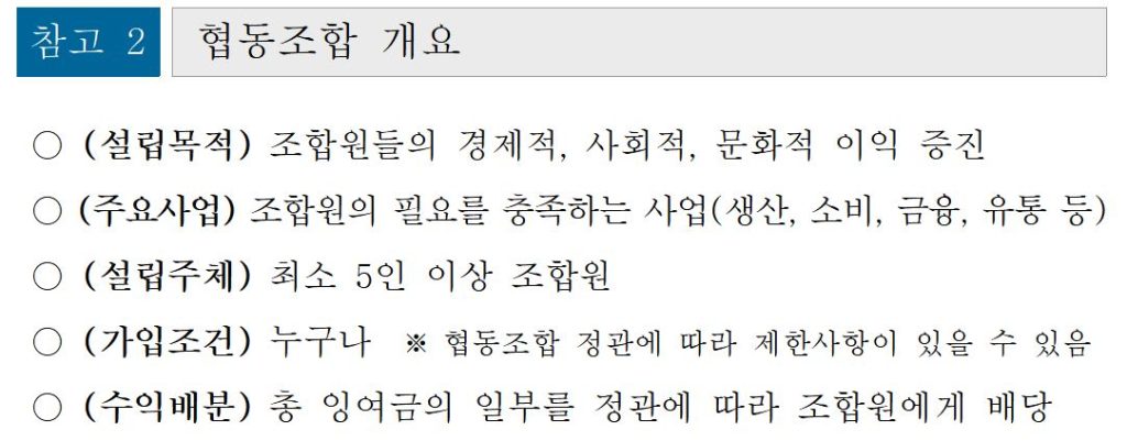 협동조합은 최소 5인 이상 조합원이 생산, 소비, 금융, 유통 등 필요를 충족하는 사업을 시행한다. 누구나 가입할 수 있으되 협동조합 정관에 따르므로 제한도 발생한다. 잉여금이 발생하면, 총 잉여금의 일부를 정관에 따라 조합원에게 배당하는 구조다. 그러므로 협동조합 설립은 조합원들의 경제적, 사회적, 문화적 이익 증진이 설립 목적에 해당하는 점을 알려드린다.