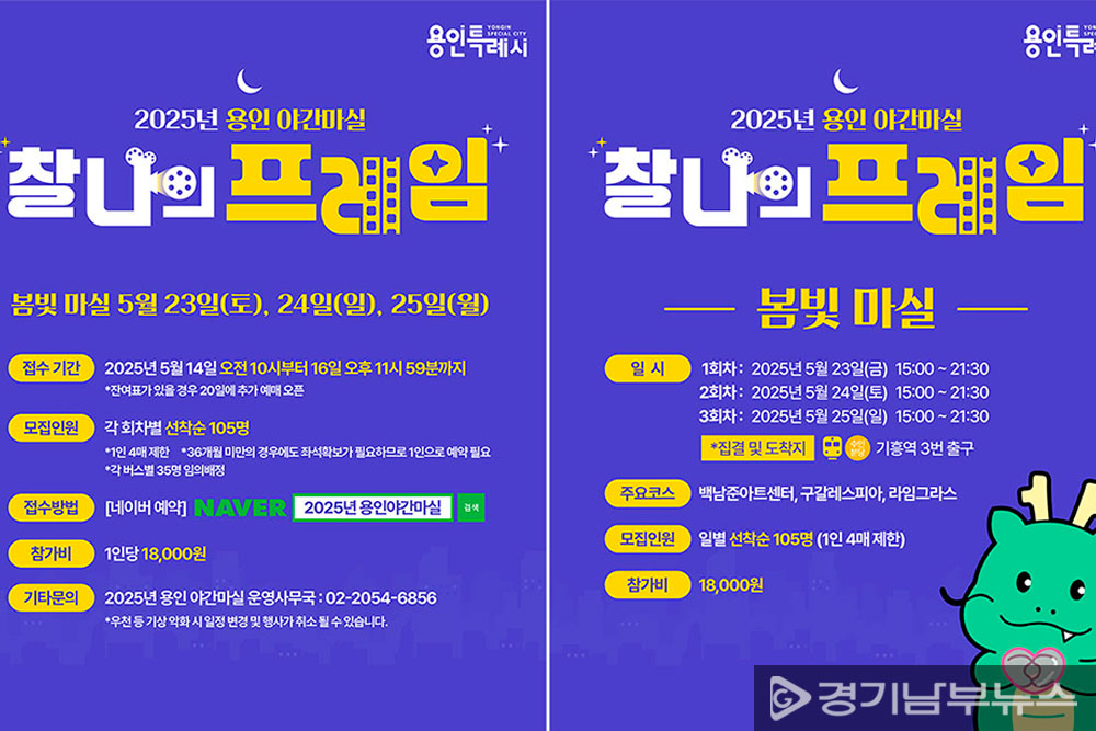 참가 신청은 네이버 검색창에 ‘2025 용인야간마실’을 검색해 신청하거나 용인관광 블로그에 게시된 안내글을 참고해 접수할 수 있으며, 선착순으로 마감된다.