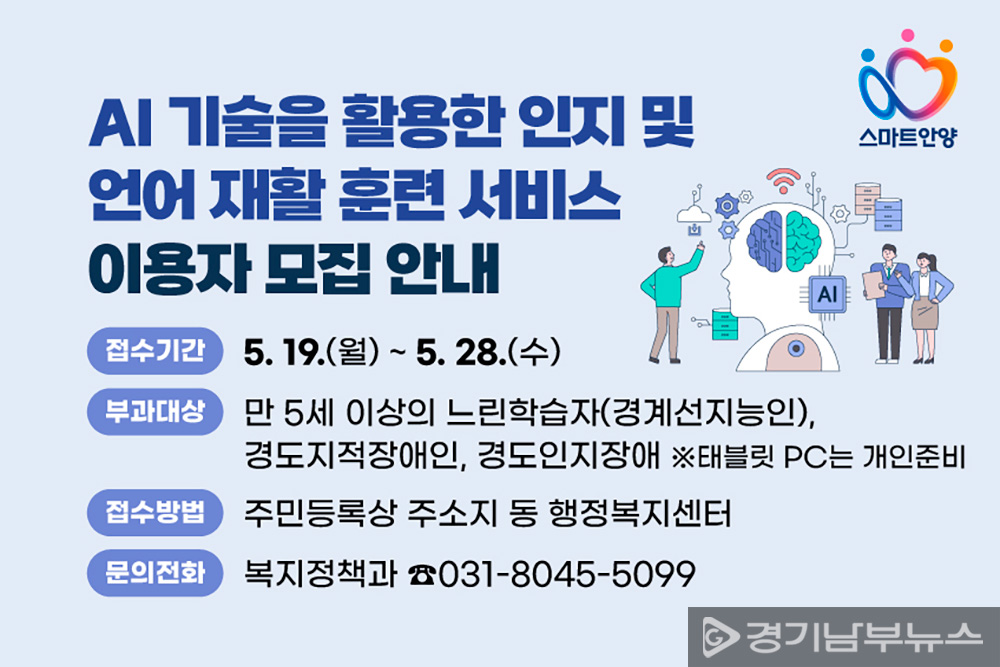안양시가 만 5세 이상의 느린학습자(경계선 지능장애), 경도지적장애인, 경도인지장애 판정자 등을 대상으로 인공지능(AI)을 활용한 인지 및 언어 재활 훈련 서비스를 운영한다. 오는 19일부터 28일까지 100명을 모집하며, 느린학습자 등이 일상생활에서 겪는 의사소통의 어려움을 돕고 삶의 질을 높이고자 계획되었다.