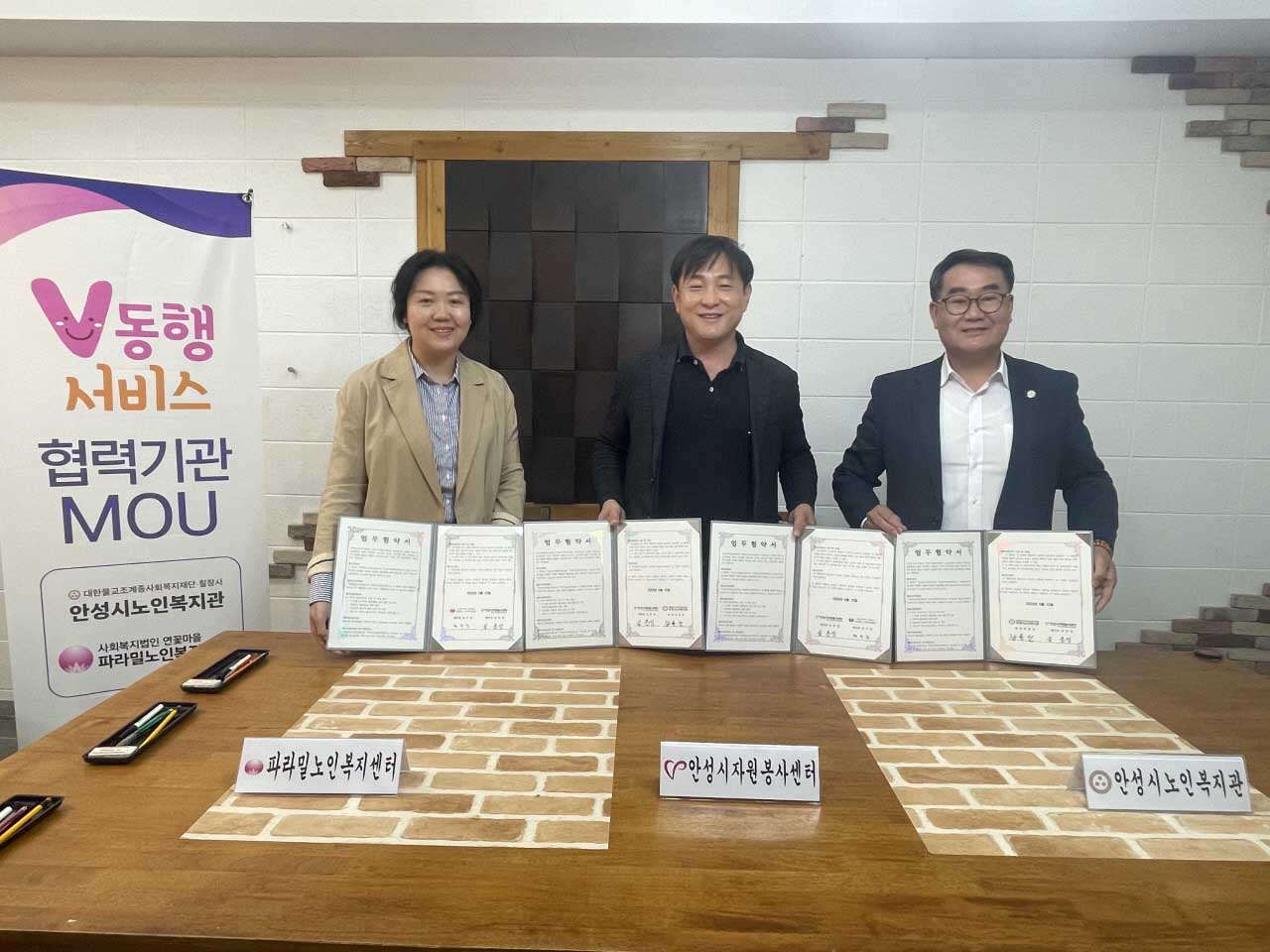 안성시자원봉사센터는 이날 간담회에서 V-동행 사업 내용, 자원봉사자 및 생활지도사의 역할 등의 사업설명을 진행하였으며, V-동행서비스 참여 기관인 안성시노인복지관과 파라밀노인복지센터, 총 2개 기관과 서비스 제공을 위한 MOU를 맺었다.