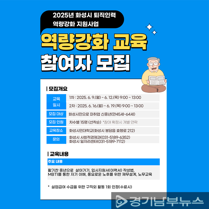 화성특례시가 신중년 퇴직자들의 원활한 사회 재진출과 안정적인 노후 생활을 지원하기 위해 ‘2025년 퇴직인력 역량강화 교육’ 참여자를 모집한다. 이번 교육은 전문적인 취업 준비와 자기계발을 통해 신중년 세대의 고용 가능성을 높이고, 재취업 기회를 확대하는 데 중점을 둔다.