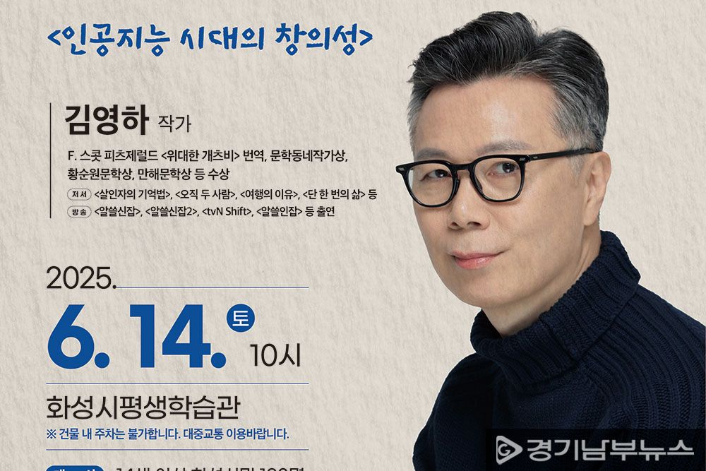 화성특례시(시장 정명근)가 오는 6월 14일 오전 10시 화성시평생학습관에서 김영하 작가를 초청해 ‘인공지능 시대의 창의성’을 주제로 인문학 특강을 진행한다. 이번 강연은 시민들이 미래 사회를 준비하며 창의적 인문 소양을 높일 수 있도록 마련된 평생학습 프로그램의 일환이다.