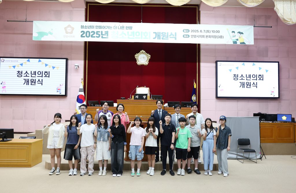 지난 6월 7일(토) 오전 10시 안양시의회(의장 박준모)는 시의회 본회의장에서 「2025년 청소년의회 개원식」을 개최했다. 청소년의회는 미래 세대의 민주시민 의식을 높이고 지역 의정 참여 기회를 확대하기 위해 마련됐으며, 이날 개원식에는 청소년의회 의원 16명을 비롯해 안양시 시의원과 학부모, 지역 주민 등이 참석했다.