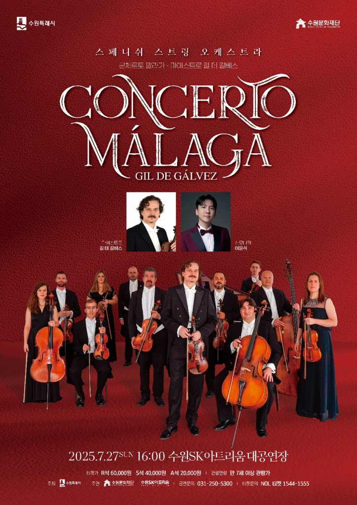 바이올리니스트이자 지휘자인 길 데 갈베스(Gil de Gálvez)가 이끄는 콘체르토 말라가는 전통과 현대를 아우르며 스페인 음악의 정수를 선보이는 명문 현악 오케스트라이다. 1996년 창단된 이 오케스트라는, 19세기 말 스페인이 미국과의 전쟁에서 패한 뒤 쇠퇴해 가던 조국의 영광을 되살리고자 문화적 부흥을 외쳤던 ‘98세대(Generación del 98)’의 정신을 계승하고자 탄생했다. 그동안 세계적인 지휘자 호세 세레브리에르, 바이올리니스트 마리아나 시르부 등과 협연하며 예술적 깊이를 더해왔으며, 유럽과 미국 등 세계 각지에서 1,000회 이상의 연주회를 개최하며 관객들의 찬사를 받아왔다.