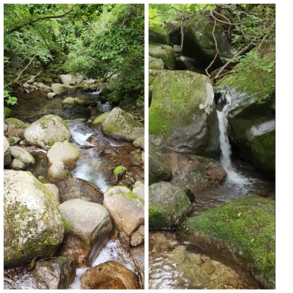 늦은맥이재에서부터 새밭주차장까지 거리는 5km 급경사와 수많은 돌길을 밝아 지루하고 시간도 의외로 많이 소요되는 거리를 계속 내려온다. 산과 산 사이의 골을 따라 걷다 보니 물 흐르는 소리가 점점 크게 들렸다. 하산을 해보니 큰 계곡이 있었고, 거센 물소릴 내며 유유히 흐르고 있었다.