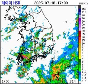 기상청은 7월 18일 오후 5시 10분, 수도권을 비롯한 충청권·전라권·경남권·제주도 전역에 호우특보가 발효 중이라고 밝혔다. 현재 전남과 제주도 지역에는 시간당 20~70mm의 폭우가 천둥·번개 및 돌풍을 동반해 쏟아지고 있으며, 남부 내륙과 충청권 남부 지역에도 10~40mm의 비가 내리고 있다.
