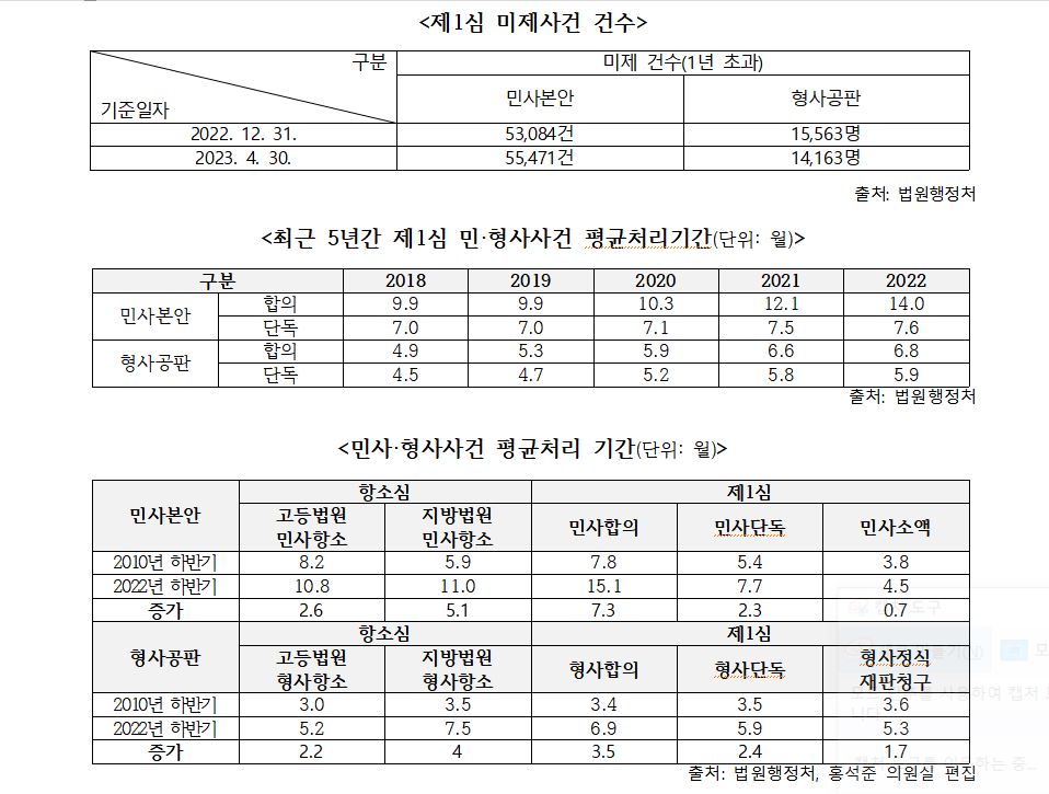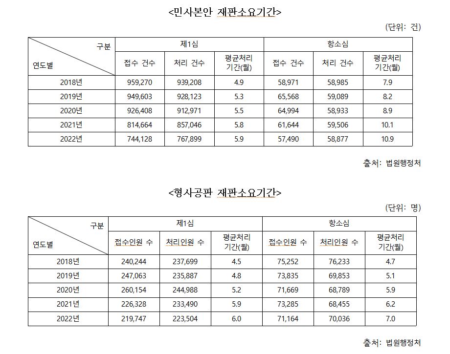 특히, 2018년 이후 민사본안 및 형사공판 제1심 및 항소심의 경우 접수 건수는 줄었음에도 평균 재판소요 기간은 오히려 계속 늘어나고 처리 건수는 줄어들고 있는 것으로 나타났다. 민사본안 제1심의 경우 2018년 939,208건을 처리하고 평균처리기간은 4.9개월이었는데, 2022년 처리건수는 767,899건으로 감소했고 평균처리기간은 5.9개월로 증가했다. 형사공판 제1심의 경우 2018년 처리인원 수는 237,699명이고 평균처리기간은 4.5개월이었는데, 2022년 처리인원 수는 223,504명으로 줄었고, 평균처리기간은 6개월로 증가했다.