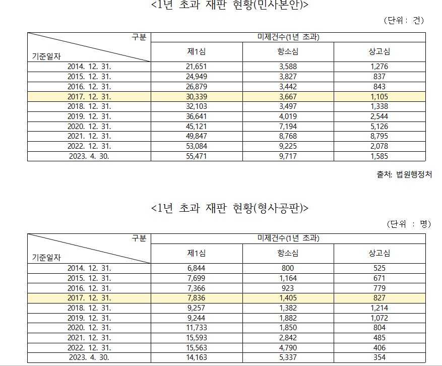 - 1년 초과 미제사건 민사본안 55,471건, 형사공판 14,163명