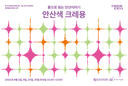 첫 번째 워크숍(2025.08.02./09/16/23) 흙으로 빚는 안산이야기 <안산색 크레용>은 안산 지 역의 흙으로 직접 비건 크레용을 만들어 그림을 그려보는 체험이다. 초등학교 3~6학년 어 린이를 포함한 가족을 대상으로 하며, 8월 2일(토)부터 매주 토요일마다 4주간 진행된다. 참 가자들은 흙으로 그려진 회화작품을 감상하고, 미술관 주변을 산책하며 흙을 채집하고 자연 을 관찰한다. 채집한 흙으로 직접 만든 크레용을 사용해 안산의 야생동물 가족을 그려보며, 지역의 흙과 생명에 대해 깊이 생각해 보는 소중한 시간이 될 것이다.