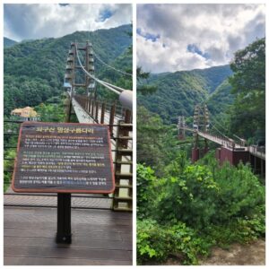 좌구산 정상을 인증하고 원점회귀하여 명상구름다리로 이동해 다리를 건너본다. 상쾌한 아침 공기를 마시고, 공중을 가로지르는 시원한 바람을 느끼며 다음 산행지인 청주로 이동한다.