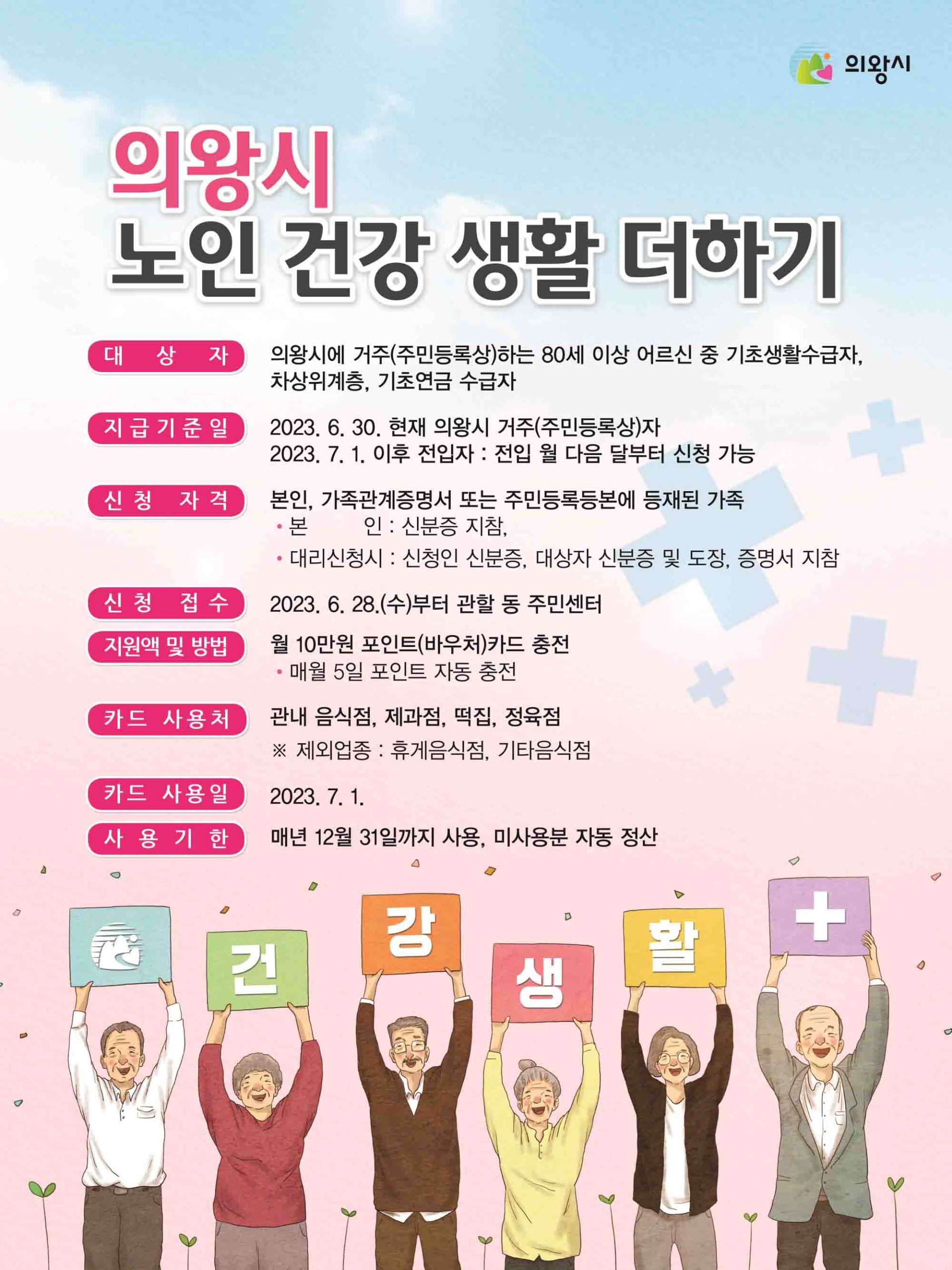 오는 28일부터 의왕시(시장 김성제)는 80세 이상 어르신 중 기초생활수급자, 차상위계층, 기초연금 수급자를 대상으로 ‘노인 건강생활 더하기 카드’ 접수를 시작한다고 밝혔다.