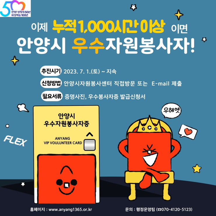 변경된 기준은 누적 봉사활동 시간 1,000시간 이상으로, 기준을 충족하는 안양시 소속 자원봉사자는 센터를 통해 우수자원봉사자증 발급을 신청할 수 있다. 발급을 희망하는 경우 신청서를 작성해 증명사진과 함께 방문 또는 이메일을 통해 제출하면 된다.