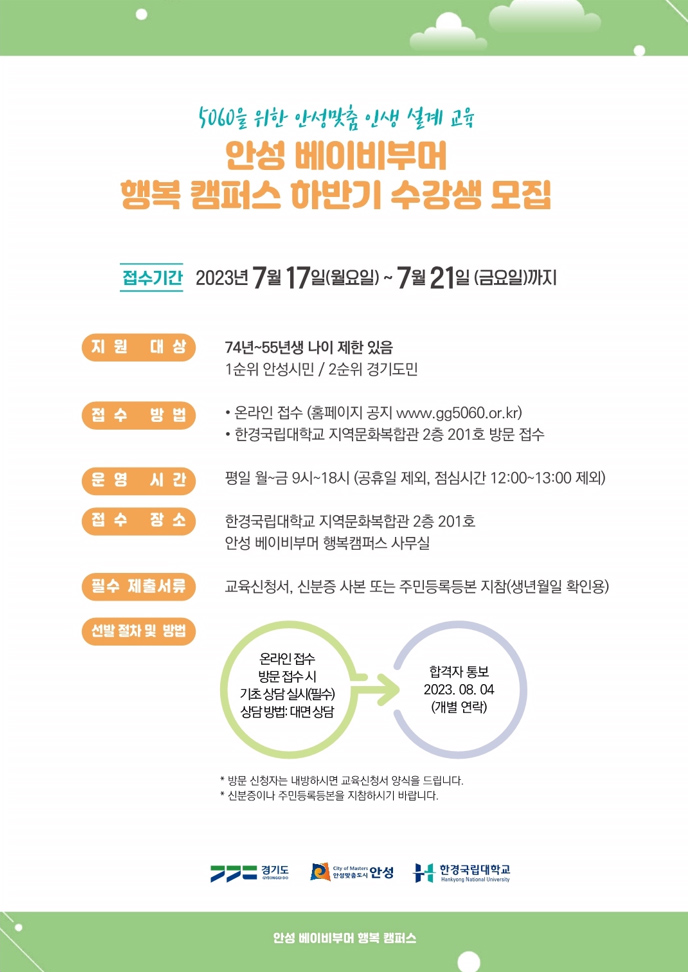 □ 한경국립대학교(총장 이원희)가 베이비부머 세대의 노후 설계, 재취업 등을 지원하는 ‘안성 베이비부머 행복캠퍼스’ 하반기 참여자를 모집한다.