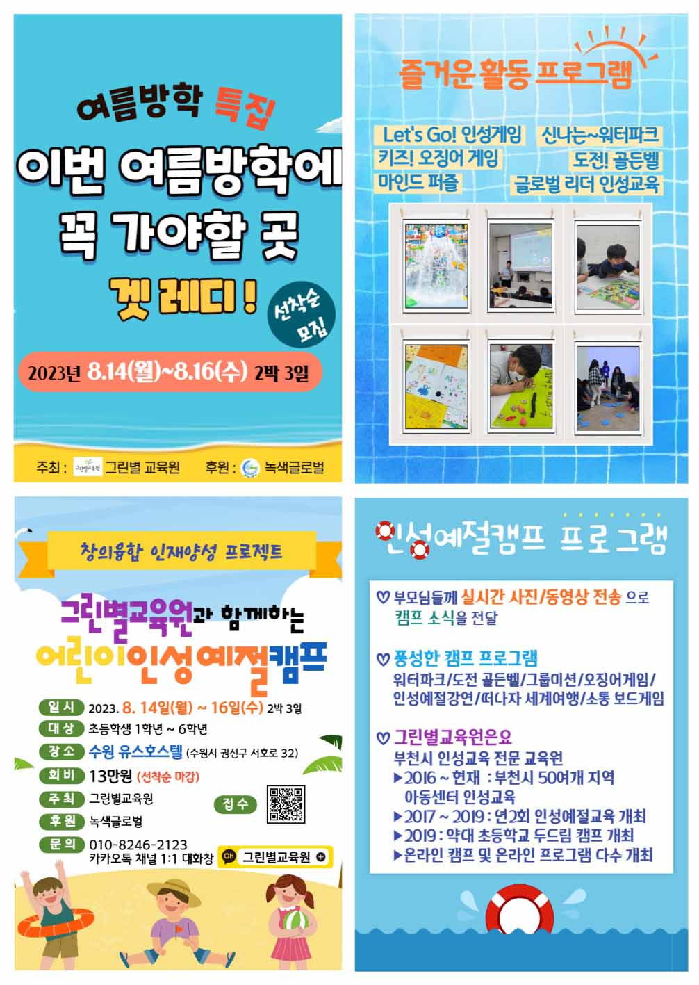 그린별교육원은 여름방학을 맞아 오는 8월 14일(월)~8월 16일(수), 2박 3일 일정으로 수원 유스호스텔에서 어린이 인성 예절 캠프를 마련한다고 3일 밝혔다.