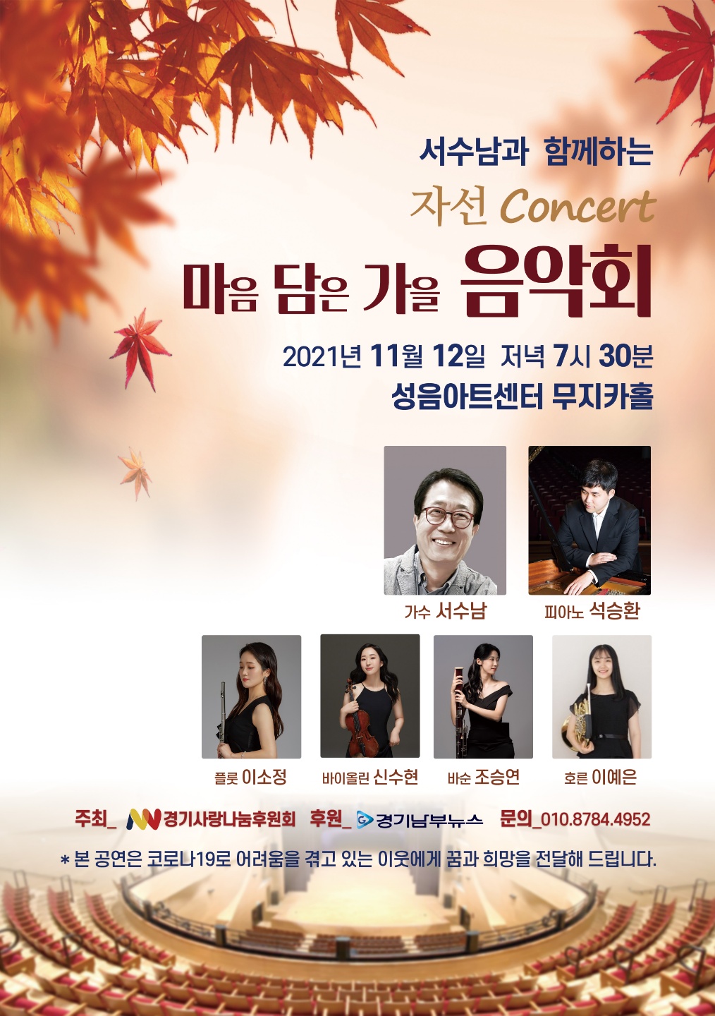 경기사랑나눔후원회는 코로나 19로 인해 소외되고 외로운 계층에게 사랑과 희망을 전하며, 지속적인 나눔의 손길을 마련하기 위해 오는 11월 12일 금요일 저녁 7시 30분에 성음 아트센타 무지카홀에서 자선음악회를 개최한다고 밝혔다.