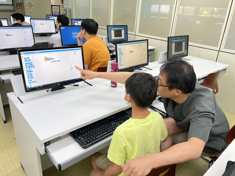 아들᛫딸과 아버지가 함께 만드는 코딩시간은 안양시 고등직업교육거점지구(HIVE) 사업과 연계해 관내 대림대학교 컴퓨터정보학부의 김영실 교수가 맡아 참여자 수준에 맞게 이끌었다. 가족은 머리를 맞대고 컴퓨터 언어로 프로그래밍을 했고 이 코딩을 활용한 ‘링키(linky) 자동차 경주대회’로 즐거운 시간을 보냈다. 경주대회 성적에 따라 다섯 가족에게는 장학금이 지급됐다.