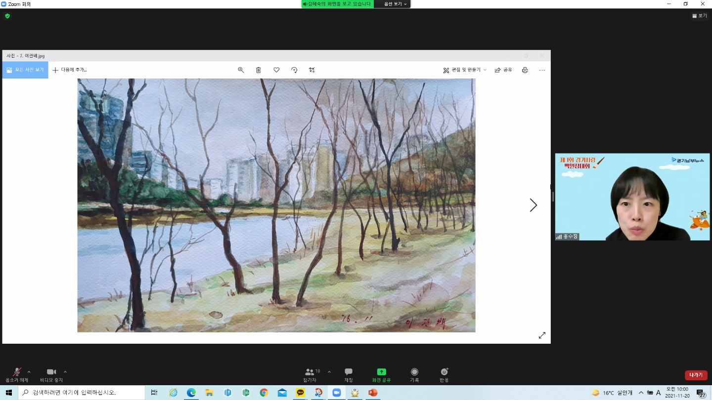 “매일 지나다니는 성남시의 탄천을 그렸는데 경기남부뉴스 상까지 받게 되다니 너무 감사합니다”(성남시 100세 이 관배) ‘제 1회 경기사랑 백일장 대회’ 시상식이 20일 온라인 줌으로 열렸다. 경기남부뉴스가 주최하고 경기사랑 백일장 운영위원회가 주관한 경기사랑 백일장대회 시상식은 응모자 12명이 참석한 가운데 비대면 방식으로 개최됐다.