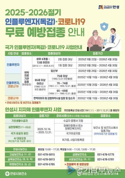 안성시는 “인플루엔자가 예년보다 이르게 유행하고 환자가 빠르게 늘고 있어 매우 우려되는 상황”이라며“특히 고위험군은 조속한 예방접종을 통해 중증 진행과 사망을 예방하는 것이 중요하다”고 당부했다.