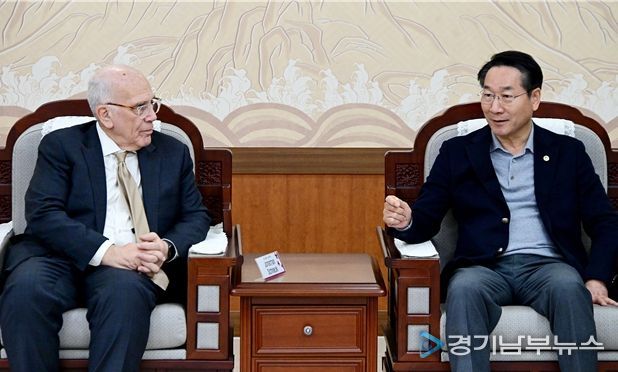 [경기남부뉴스 김정옥 기자] 유정복 인천시장은 12월 3일 오후 인천시청 접견실에서 세계 최고 수준의 의과·바이오 연구 중심 대학인 존스홉킨스대의 조나단 슈넥(Jonathan schneck) 의과대학 교수(왼쪽) 일행을 접견했다.