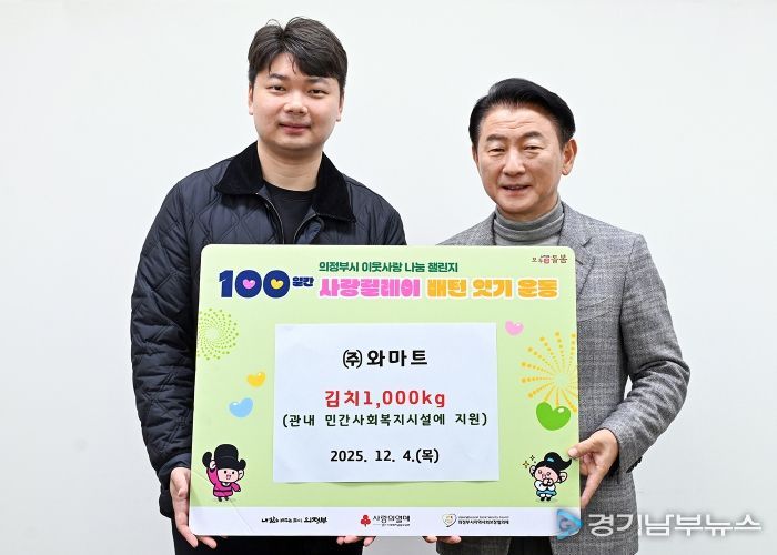 [경기남부뉴스 홍복순 기자] 의정부시는 12월 4일 ㈜와마트가 ‘100일간 사랑릴레이 배턴 잇기’에 동참해 관내 민간사회복지시설에 김치 1천kg을 기부했다고 밝혔다.