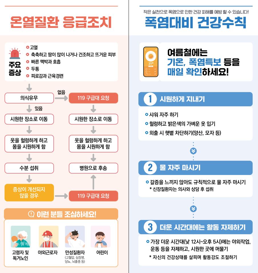 특히 올해에는 폭염이 지속될 것으로 전망되며 폭염은 열사병, 열경련 등의 온열질환을 유발할 수 있고, 심하면 사망에 이르게 된다. 온열질환을 예방하기 위해서 물을 자주 마시고 낮 시간 야외활동을 최대한 자제해야 하며, 어지러움, 두통, 메스꺼움 등 증세가 보이면 즉시 활동을 중단하고 시원한 곳으로 이동해 휴식을 취해야 한다. 음주는 체온을 상승시키고, 카페인이 들어간 커피나 탄산음료는 이뇨 작용으로 탈수를 유발하므로 술과 카페인 섭취를 자제하는 것을 권장한다.