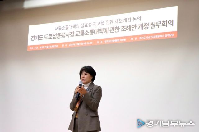 [경기남부뉴스 김혜숙 기자] 경기도의회 건설교통위원회 서성란 의원(국민의힘·의왕2)은 4일 경기도인재개발원 다산홀에서 열린 ‘경기도 도로점용공사장 교통소통대책에 관한 조례안 개정 실무회의’에 참석해 조례 개정의 방향과 제도 개선 필요성을 강조했다.