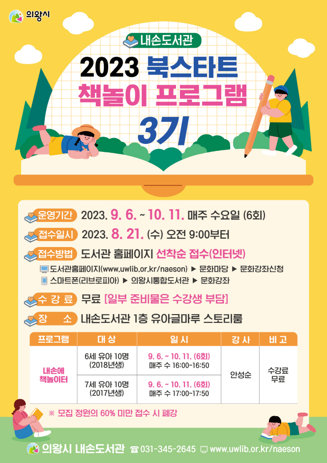 프로그램과 관련한 자세한 사항은 의왕시 내손도서관팀(☎031-345-2645)으로 문의하면 안내받을 수 있다.