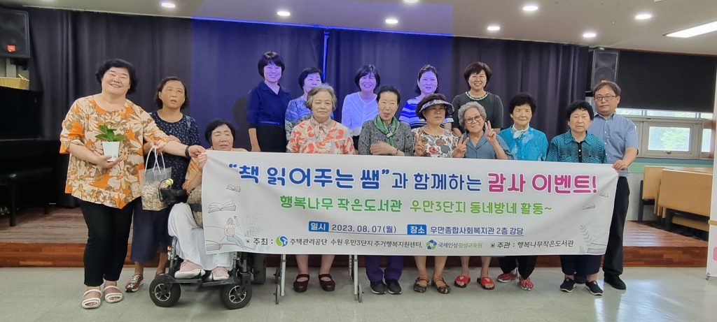 홍현숙 행복나무작은도서관장은 “‘책 읽어 주는 쌤’으로 우만3단지 어르신 한분 한분을 만났는데 호응도 좋으셨고 마음으로 가까워지는 귀중한 시간이었다. 이 프로그램을 제안해주신 박은주 소장님께 다시 한번 감사드린다“라고 말했다.