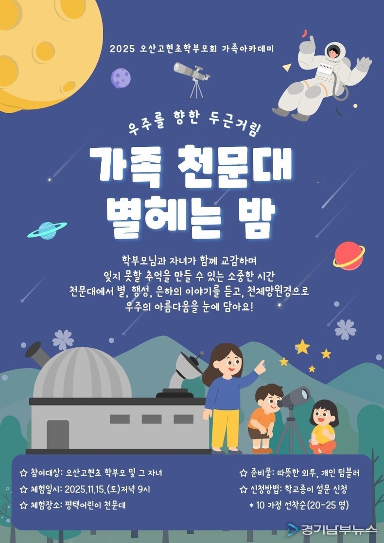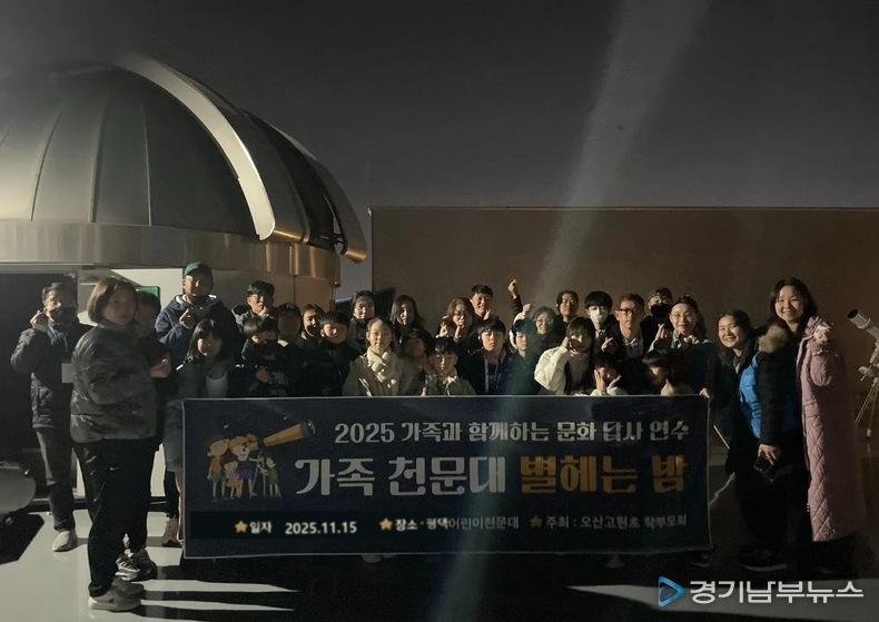 [경기남부뉴스 김혜숙 기자] 오산고현초등학교 학부모회가 주최한 특별한 교육 행사인 '가족 천문대 별헤는 밤'이 지난 11월 15일, 평택 어린이 천문대에서 뜨거운 관심 속에 성황리에 마무리됐다. 빛나는 밤하늘 아래에서 가족 간 소중한 추억을 쌓는 뜻깊은 시간이었다.