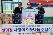 [경기남부뉴스 김정옥 기자] 수원특례시 영통구 영통3동은 지난 11일, 다가오는 설 명절을 맞아 관내 취약계층을 위한 이웃나눔 전달식을 진행했다. 이번 전달식은 설 명절을 맞아 경제적 어려움을 겪는 저소득층과 복지사각지대 이웃들이 따뜻한 명절을 보낼 수 있도록 마련됐다. 후원물품은 햄, 라면, 생필품 등 다양한 품목으로 구성됐으며, 관내 취약계층 200여 세대에 전달될 예정이다. 진성원 영통3동 단체협의회장은 “설 명절을 맞아 여러 기관이 뜻을 모아 지역 이웃들을 위한 나눔에 함께 참여했다. 각 기관의 정성이 모인 후원물품이 어려운 이웃들의 생활에 작은 보탬이 되길 바란다”고 전했다. 김인태 영통3동장은 “여러 기관이 함께해 주신 소중한 후원에 깊이 감사드린다. 전달된 후원물품은 도움이 필요한 이웃들에게 전달해 따뜻한 명절을 보낼 수 있도록 하겠다”고 말했다.