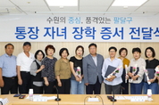 7명의 대학생 장학생으로 최종 선발...최대 100만원 지급 수원시 팔달구(구청장 이상균)는 지난 20일 구청 상황실에서 지역사회발전과 주민화합에 기여하고 있는 통장 7명에게 ‘통장 자녀 장학 증서’를 전달했다. 통장 자녀 장학생 선발은 ‘수원시 통장 자녀 장학금 지급 조례’에 따라 1년 이상 근속한 통장의 자녀로서 무상교육 대상이 아닌 중‧고등학생 및 대학생 통장 자녀를 대상으로 품행이 단정하고 학업성적이 우수한 학생을 선발하는 제도이다. 팔달구는 이달 6일까지 각 동에서 신청을 받아 장학금 심사 기준과 타 장학금 중복수혜 여부 등 확인 절차를 거쳐 7명의 대학생을 장학생으로 최종 선발했다. 선발된 대학생에게는 최대 100만원이 지급된다. 장학 증서 전달식에 참석한 유지현 팔달구 통장협의회장은 “2019년 개정된 조례로 대학생 통장 자녀까지 확대되어 일곱분의 통장님께서 장학증서를 받게 되어 기쁘다. 팔달구를 위해 최일선에서 솔선수범하는 통장님들을 응원하겠다”고 말했다. 이상균 팔달구청장은 “주민과 행정의 가교역할을 해주시는 통장님들께 항상 감사드리며, 통장 자녀 장학금이 통장님들의 사기를 진작하고 장학생들이 수원시의 훌륭한 인재로 성장하길 바란다”고 전했다