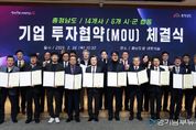 [경기남부뉴스 김혜숙 기자] 국내외 기업 투자 유치를 핵심 과제로 추진 중인 충남도가 이번엔 14개 기업으로부터 5000억 원 이상의 투자를 이끌어내며 충남의 지속 가능한 미래 발전 발판을 다졌다. 김태흠 지사는 26일 도청 대회의실에서 김석필 천안시장 권한대행 등 6개 시군 단체장 또는 부단체장, 이동주 성창오토텍 대표이사 등 14개 기업 대표와 투자협약을 체결했다. 협약에 따르면, 14개 기업은 2029년까지 6개 시군 산업단지 등 50만 64㎡의 부지에 총 5090억 원을 투자해 생산시설을 신·증설하거나 이전한다. 이들 기업이 계획대로 가동할 경우 신규 고용 창출 인원은 526명으로 예상된다. 천안 북부BIT일반산단에는 4개 기업이 생산시설을 신·증설한다. 자동차용 부품업체인 성창오토텍이 2만 3225㎡부지에 542억 원을 투자해 공장을 새롭게 만든다. 또 반도체·PCB 표면 처리 장비 전문업체인 하이쎄미코가 132억 원을 투자해 6311㎡부지에 공장을 신설하며, 산업용 로봇 제조업체 아라는 100억 원을 투자해 1100㎡부지에 생산시설을 확장한다. 수입