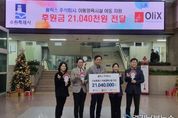 [경기남부뉴스 김정옥 기자] 올릭스(주)가 “아동 양육시설에 전달해 달라”며 수원시에 성금 2104만 원을 기부했다. 올릭스 이동기 대표이사, 강충길 사장은 18일 수원시청을 방문해 김은주 여성가족국장에게 성금을 전달했다. 올릭스는 2020년부터 2023년까지 수원시 아동양육시설에 꾸준히 성금을 후원했다. 지금까지 기부 금액이 총 6800만 원에 이른다. 기부금은 직원들의 자발적 모금과 회사 후원금으로 마련했다. 수원시는 경기사회복지공동모금회 지정기탁 방식으로 경동원, 동광원, 꿈을키우는집, 수원나자렛집 등 아동 양육시설 4개소에 성금을 배분할 예정이다. 이동기 올릭스 대표이사는 “양육시설에서 사는 아동들이 따뜻한 겨울을 보내길 바라며 후원금을 준비했다”며 “아이들이 꿈을 꾸며 자라는 수원시가 됐으면 한다”고 말했다. 올릭스는 RNA 간섭 플랫폼 기술을 기반으로 다양한 질환에 대한 제3세대 혁신 신약을 개발하는 기업이다. 2020년 12월 ‘혁신형 제약기업’(보건복지부) 인증을 받았고, 2022년에는 ‘우수기업연구소’(과학기술정보통신부 주관)로 선정됐다.