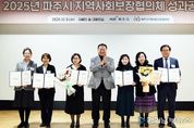 [경기남부뉴스 홍복순 기자] 파주시는 지난 3일, ‘지혜의 숲’대회의실에서 '2025년 지역사회보장협의체 성과공유회’를 개최했다. 이번 행사에는 대표협의체, 실무협의체, 분과위원, 읍면동 협의체 위원 등 150여 명이 참석했으며, 공공위원장 김경일 시장과 민간위원장 이보경 위원장이 공동으로 주관했다. 올해 성과공유회는 ‘함께라서 빛났던 2025년, 반짝이며 나아갈 2026년’을 주제로, 한 해 동안 지역 복지를 위해 헌신한 협의체 활동을 돌아보고, 현장의 성과를 확산하기 위한 취지로 마련됐다. 행사 전 참여자들이 작성한 붙임쪽지는 행사장 앞 성탄절 나무에 장식되어, 각자의 바람과 격려가 하나의 공동체적 상징으로 모아졌다. 성탄절 나무 쪽지 걸기 시연회는 올 한 해 서로 간에 다져온 협력의 의미를 되새기고, 다가오는 2026년을 향한 희망을 함께 공유하는 시간으로 이어졌다. 1부 행사에서는 협의체 위원 소개와 함께 유공자 24명 및 특화사업 우수 읍면동 3개소에 대한 표창이 진행됐으며, 공동위원장 두 명의 기념사를 통해 한 해의 활동을 마무리하는 알림말(메시지)이 전해졌다. 이어 활동 영상 상영,