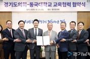 [경기남부뉴스 김혜숙 기자] 경기도의회는 23일 오전 의장 접견실에서 동국대학교와 교육협력 및 학술교류를 위한 업무협약(MOU)을 체결했다. 이날 협약식에는 김진경 의장(더민주, 시흥3)과 고준호 의원(국민의힘·파주1), 김완규 의원(국민의힘·고양12), 이병숙 의원(더민주·수원12), 박호순 의정국장이 참석했다. 동국대학교에서는 윤재웅 총장, 김용현 교무부총장, 김승용 대학원장, 유한림 BMC(바이오메디캠퍼스) 행정처장 등이 함께 자리해 협약의 의의를 더했다. 양 기관은 이번 협약을 계기로 ▲의정 발전을 위한 정보 교류 ▲전문 인재 양성을 위한 교육·연구 지원 ▲도의원 및 의회 직원 대상 대학원 장학금 지원 등 의정 활동 역량 강화를 위한 체계적인 교육 협력에 나서기로 했다. 윤재웅 총장은 “대학의 교육·연구 역량을 공유함으로써 경기도 발전에 기여할 수 있게 되어 뜻깊다”며 “경기도의회와의 지속적인 협력을 통해 실효성 있는 교육 지원을 이어갈 수 있도록 최선을 다하겠다”라고 말했다. 김진경 의장은 “의회에 대한 도민의 기대는 점점 더 복잡해지고 다양화되고 있는 만큼 의회 구성원 모두