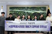 [경기남부뉴스 김혜숙 기자] 서울특별시의회 최호정 의장(국민의힘, 서초4)은 26일 의회 본관 의장접견실에서'제8기 겨울방학 대학생 인턴 간담회'를 개최하고, 청년들과 서울시 정책 현안, 일·가정 양립 고민 등을 주제로 진솔한 대화를 나눴다. 이번 간담회에는 대학생 인턴 7명이 참가했으며, 각자가 수행 중인 정책 연구 주제와 활동 소감을 공유했다. 참석한 대학생 인턴들은 본인의 전공과 관련된 정책 연구를 소개하며 활동 경험을 공유했다. 주요 연구 주제는 △서울시와 2개 자치구의 기후 위기 대응 △서울시 교육환경 변화 대응 △서울시 폐교 활용과 관련된 정책 방안 △서울시 축제 육성 및 활성화 방안에 대한 연구 △한강 이용정보 통합 앱 구축 및 활용방안 연구 △우리나라 정치·사회 갈등에 대한 대학생들의 인식 및 갈등 연구 등이다. 인턴들은 “정책이 논의되고 결정되는 과정을 가까이에서 직접 경험할 수 있는 매우 뜻깊은 시간이었다”고 소감을 밝혔다. “특히 정책결정의 무게와 공공부문의 책임을 현장에서 체감했다. 향후 진로와 사회적 역할에 대해 깊이 고민해보는 계기가 됐다”고 전했다. 최호정 의장은 “짧은 기간 동안