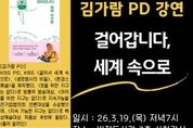 [경기남부뉴스 김혜숙 기자] 평택시 비전도서관은 3월 19일 저녁 7시 김가람 KBS PD를 초청하여 ‘걸어갑니다, 세계 속으로’를 주제로 야간 인문학 강연을 진행한다. 부지런히 '세계 속으로' 가느라 담지 못한 '걸어서' 만난 사람들의 이야기를 비롯해 휴가와 출장의 탈을 쓴 '걸어서 세계 속으로' '여행' 이야기를 통해 프로그램 제작 노하우 및 에피소드와 여행, 환경 PD로서 경험한 세계의 다양한 문화를 공유하면서 삶이 더욱 풍요로워지는 이야기를 들려줄 예정이다. 김가람 PD는 KBS PD로 '걸어서 세계 속으로', '생로병사의 비밀', '환경 스페셜' 등을 제작했다. '옷을 위한 지구는 없다'로 방통위 방송대상, '아이를 위한 지구는 없다'로 지속가능발전기업협의회 언론상 대상을 수상했으며, '지속 가능한 지구는 없다'로 백상예술대상 작품상 후보에 올랐다. 지은 책으로는 '우리가 말하지 않는 지구', '걸어갑니다, 세계 속으로', '카메라로 지구를 구하는 방법' 이 있다.