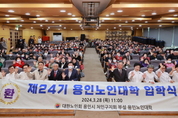 용인특례시(시장 이상일)는 지난 26일과 28일 ‘기흥노인대학’과 ‘용인노인대학’ 입학식을 열었다고 밝혔다. 2년 과정으로 운영되는 용인노인대학은 매주 목요일 오전 10시부터 12시, 기흥노인대학은 화요일 오전 10시부터 12시까지 운영되며, 내년 11월까지 매주 총 60회에 걸쳐 운영된다. 이 곳에서 학생들은 교양과 시사, 건강관리, 문화탐방 등의 강의를 들을 수 있다. 지난 26일에는 ‘제12기 기흥노인대학’ 입학식이 기흥노인복지관 대강당에서 열렸다. 이날 입학식에는 학생과 내빈 120여명이 참석했다. 기흥노인대학의 신입생 중 최고령 학생은 장석동씨(남‧88세)와 임옥춘씨(여‧88세)다. 28일 목요일 처인노인복지관 대강당에서도 이색적인 풍경의 입학식이 열렸다. 대한노인회 용인시처인구지회가 주최한 ‘제24기 용인노인대학 입학식’에는 130여명의 학생과 내빈이 참석해 학업에 대한 열정을 서로 응원했다. ‘제24기 용인노인대학’의 교육생은 총 120명이다. 이 중 유병원씨(여‧90)가 최고령 신입생으로 기록됐다. 남학생 중에는 이재기씨(남‧87)가 최고령 학생이다. 용인특례시에는 (사)대한노인회 용인시 3개구 지회 부설로 노인대학이 운영 중이다. 처인구에는